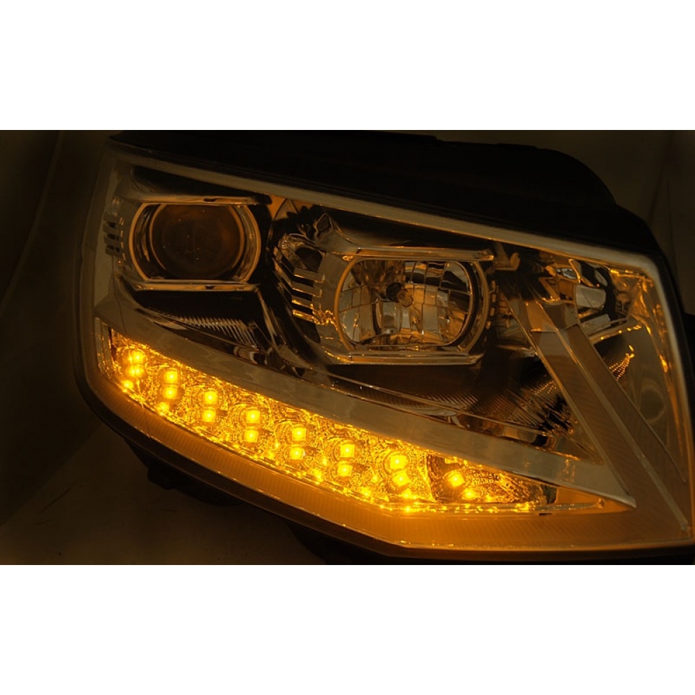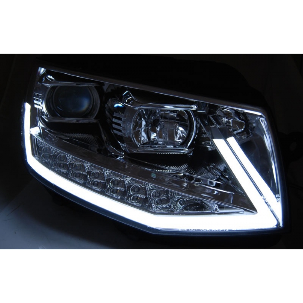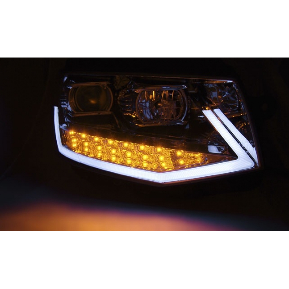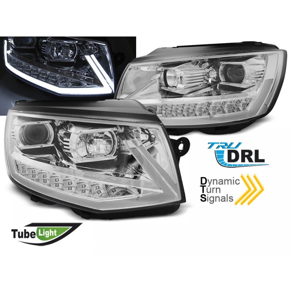 VW T6 (15-19) priekšējie lukturi LED TUBE DRL, dinamiskie pagriezieni, hromēti