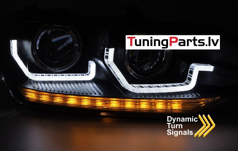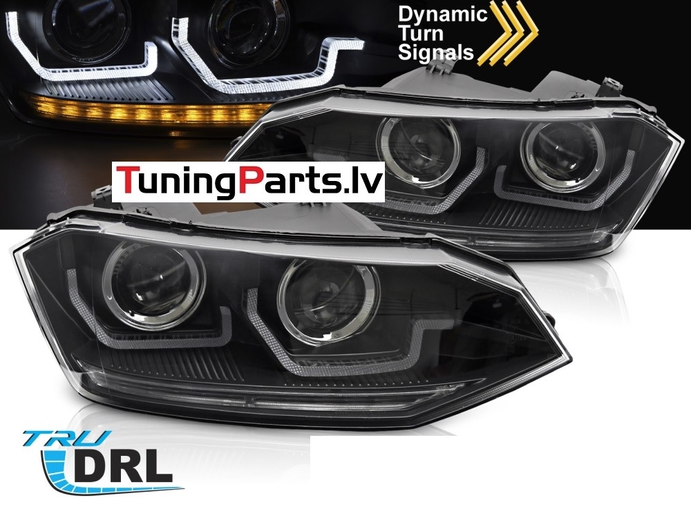 VW Polo VI 2G (17-21) priekšējie LED DRL lukturi, dinamiskie pagriezieni, melni