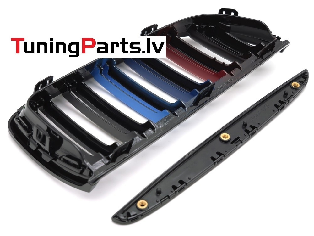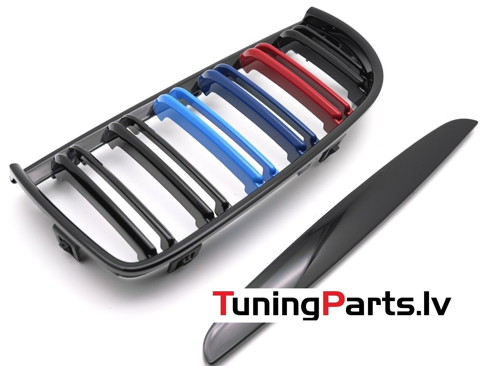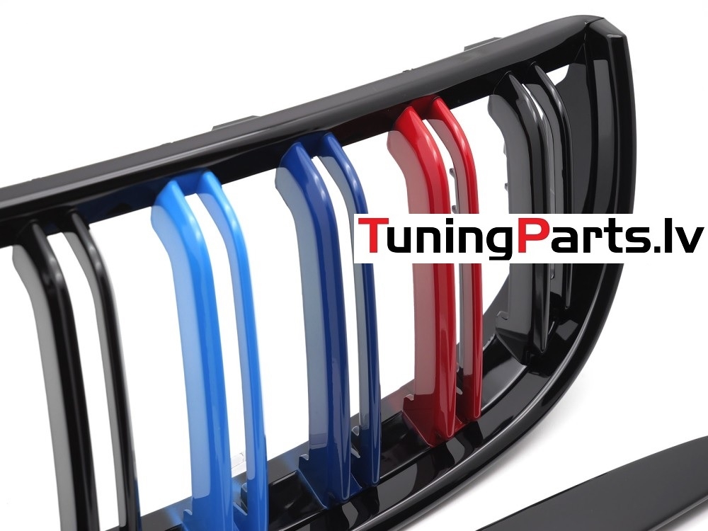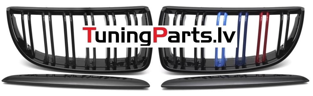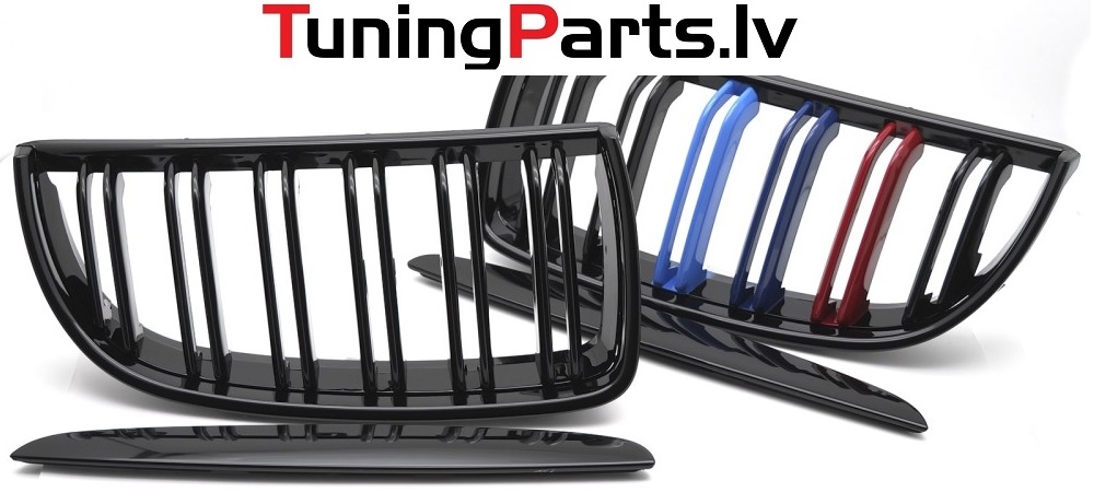BMW E90/E91 (05-08) priekšējās restes + uzlikas melnas/glancētas 3 krāsu dubultās