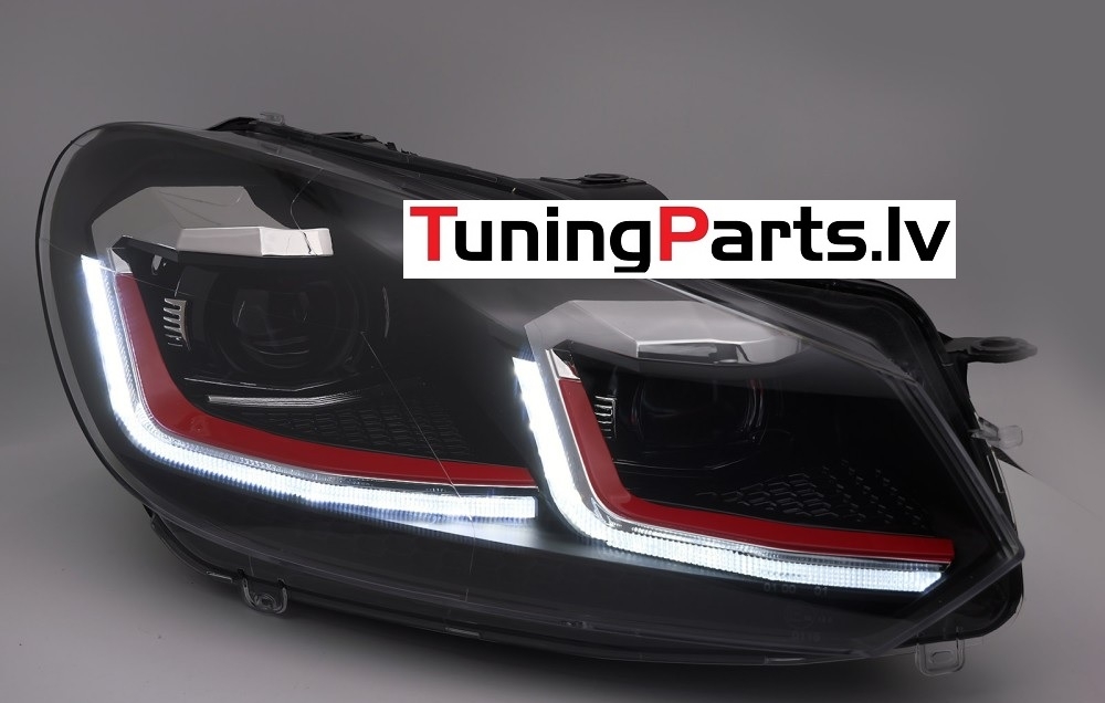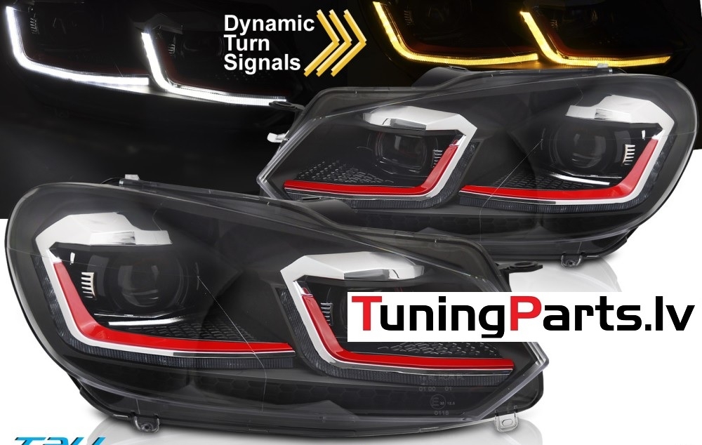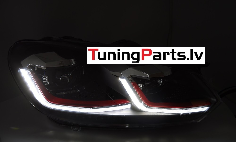 VW Golf 6 (08-12) priekšējie LED DRL lukturi, dinamiskie pagriezieni, melni, sarkanas līnijas